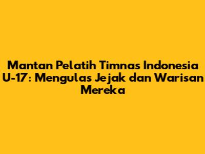 Mantan pelatih Timnas Indonesia U-17 telah meninggalkan warisan yang tak terlupakan bagi sepak bola Indonesia. Mereka telah memberikan kontribusi yang signifikan dalam pembinaan pemain usia muda, mengembangkan potensi pemain, dan menginspirasi generasi muda untuk mencintai sepak bola. Meskipun menghadapi berbagai tantangan, mereka tetap berkomitmen untuk memberikan yang terbaik bagi para pemain muda.